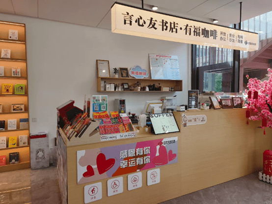 初次经过的人,很容易把它当作一间文艺书店。推门而入,咖啡豆的醇香弥漫在空气中,书架上陈列着数千册图书,角落里摆放着残疾人手作的工艺品,潮玩元素穿插点缀其间。常喝美式的小梅第一次路过时,隔着落地窗拍下一张照片,配文写道:“第一次在浦口邂逅福彩咖啡店,真是惊喜。”
