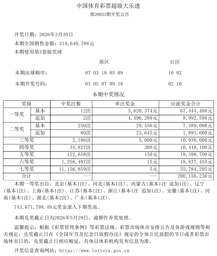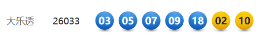 3月30日,超级大乐透第26033期开奖。前区开出号码03、05、07、09、18;后区开出号码02、10。本期全国销售3.19亿元,为国家筹集彩票公益金1.15亿元。